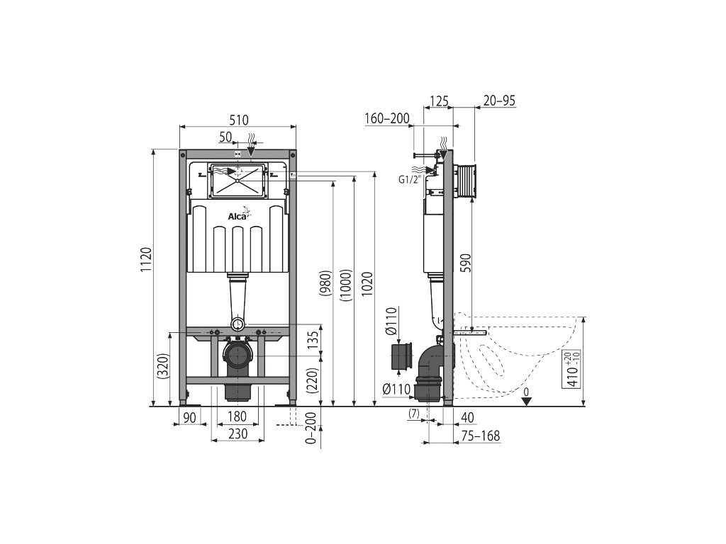 - Pro montáž závěsného WC s připojovací roztečí 180 mm nebo 230 mm