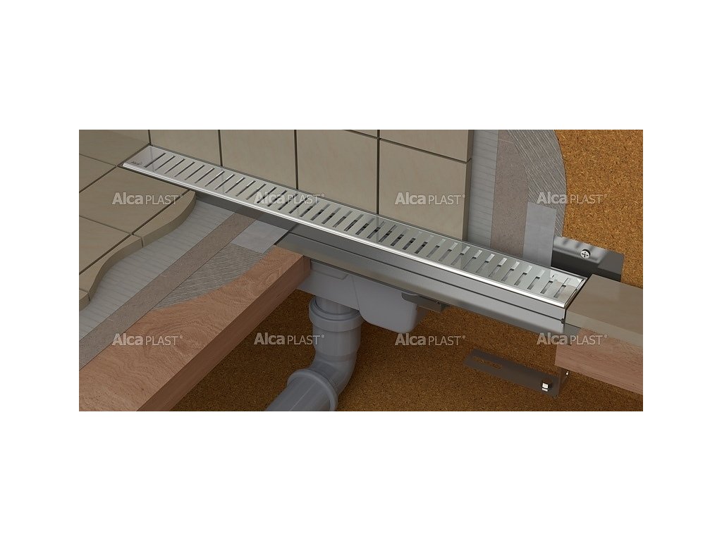 Alcadrain APZ1004-750 Flexible podlahový žlab s okrajem pro perforovaný rošt a s nastavitelným límcem ke stěně, svislý odtok (dříve Alcaplast)