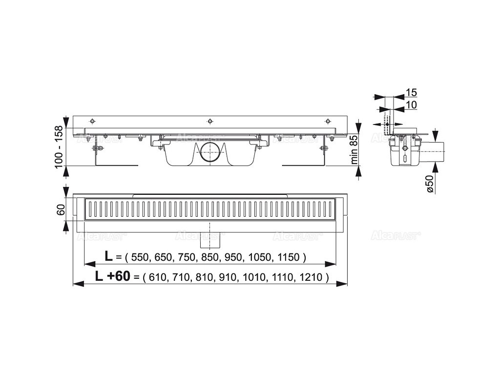 Alcadrain APZ4-850 Flexible Podlahový žlab s okrajem pro perforovaný rošt a s nastavitelným límcem ke stěně (dříve Alcaplast)