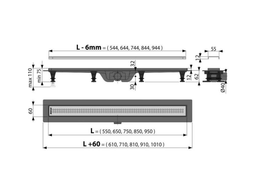 APZ9–850 SIMPLE – liniový plastový podlahový žlab, sprchový kanálek s nerez mřížkou 850 mm Technické parametry Alcaplast APZ9 Simple
