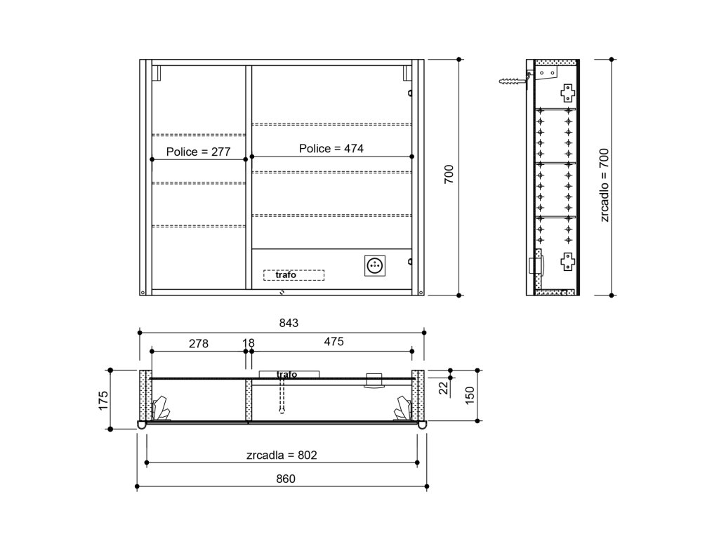 | Výbava: | Osvětlení;Integrovaná el. zásuvka;Oboustranná zrcadlová dvířka;Zpomalovací panty |