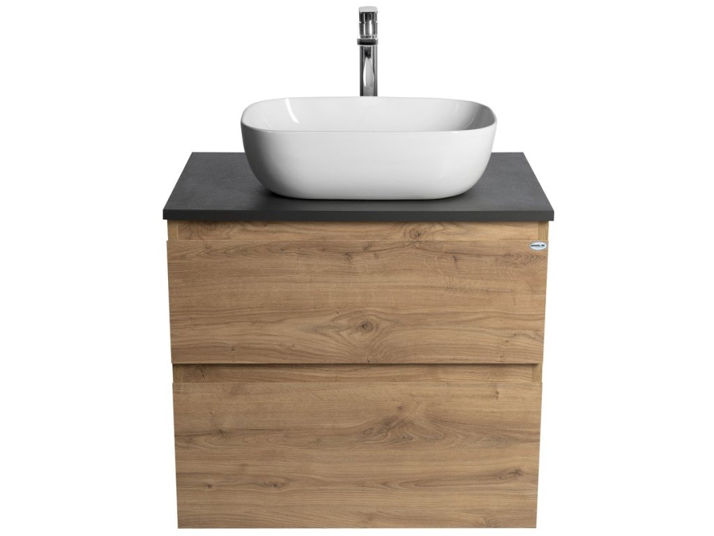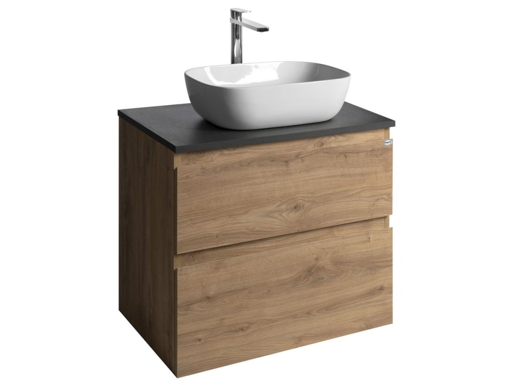 Koupelnový nábytek ALTAIR s deskou ALTAIR (HPL) v dekoru dub emporio a antracit břidlice platin lze kombinovat s umyvadly na postavení.