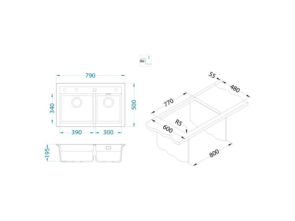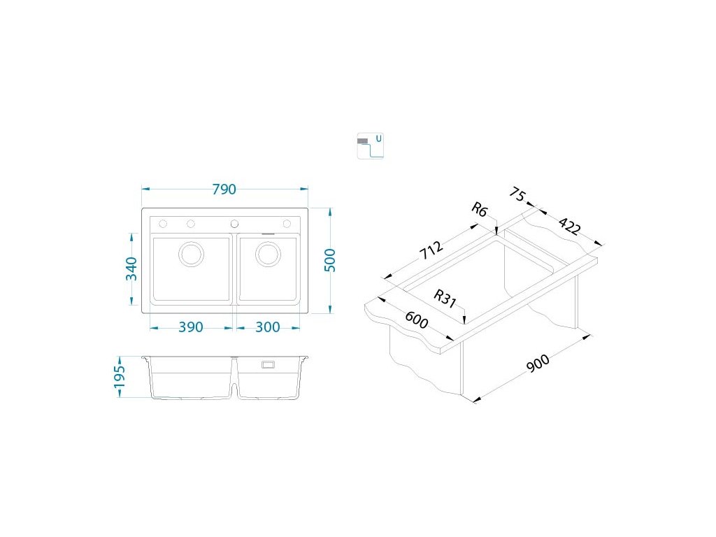 - Úchyty a těsnění pro upevnění dřezu v balení