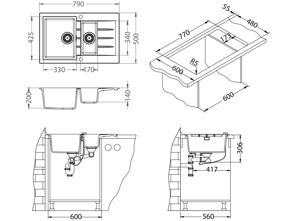 - Úchyty a těsnění pro upevnění dřezu v balení