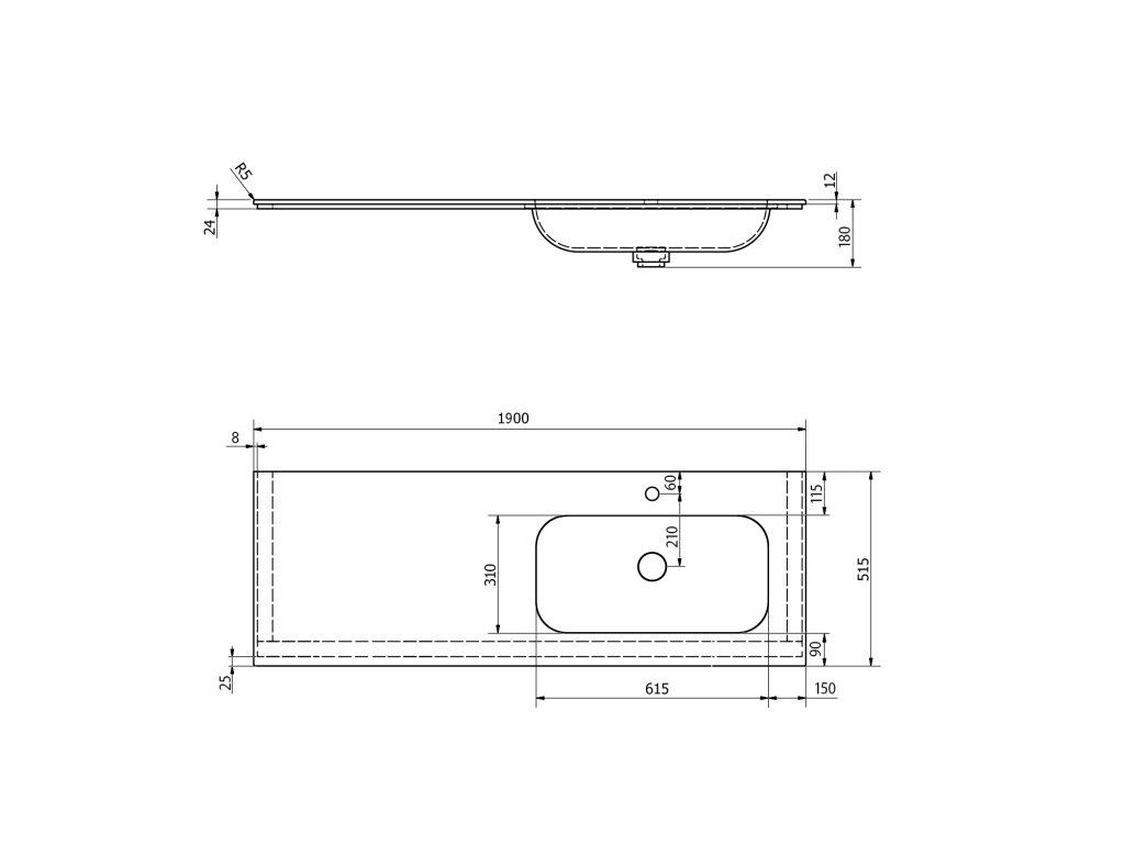 Zátka umyvadlové výpusti je vyrobena ze stejného materiálu jako umyvadlo. V otevřené poloze je zátka v jedné rovině se dnem umyvadla. Umyvadlo lze umístit na konstrukci, konzole nebo zakázkový nábytek.