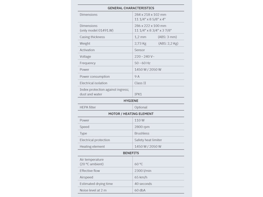 BIGFLOW EVO bezdotykový elektrický osoušeč rukou 220-240V, 2050W, 222x286x100mm, ABS/bílá