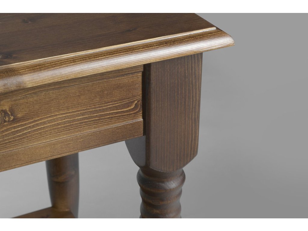 Umyvadlové stolky CIMBURA v rustikálním stylu navodí atmosféru venkovského stavení. Stolky jsou vyrobené ze smrkového masivu, mají soustružené nohy a řemeslná zručnost se odráží i v desce s oble vyřezanou hranou.