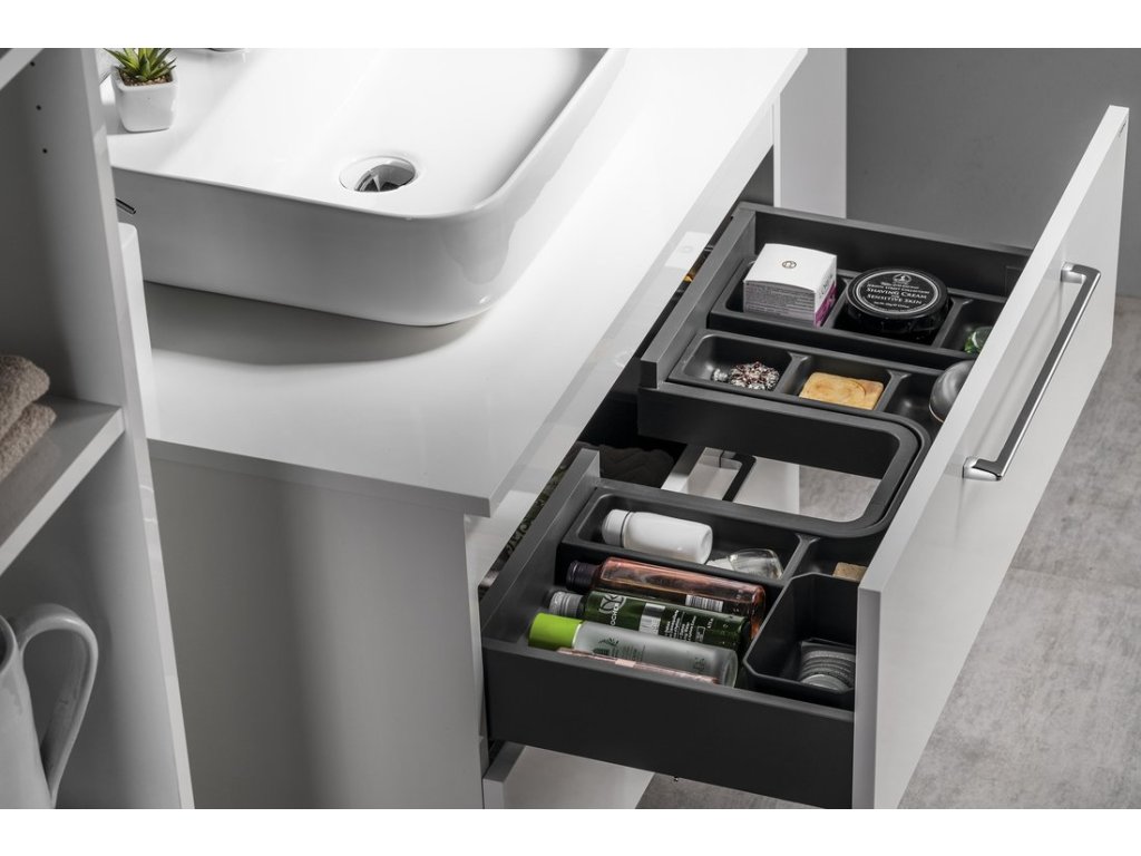 Velkou výhodou je možnost objednání praktických organizérů a misek LINDO pro uložení předmětů každodenní potřeby do horní i spodní zásuvky. Zásuvky jsou vybaveny výsuvy s pomalým dojezdem a automatickým dovřením, dvířka mají kování s tlumeným dovíráním. Úložný prostor lze rozšířit přidáním doplňkových skříněk ESPACE.