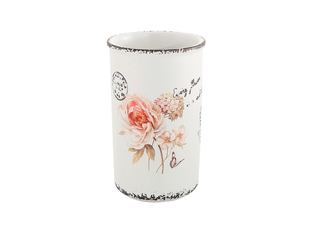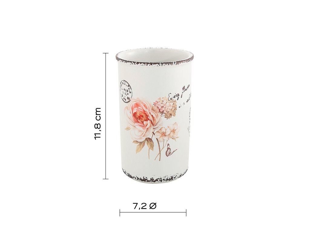 Něžný květinový dekor a provedení na pohled působící dojmem plechových nádobek koupelnových doplňků CLOTHILDE z keramiky potěší v koupelně zařízené v retro stylu.