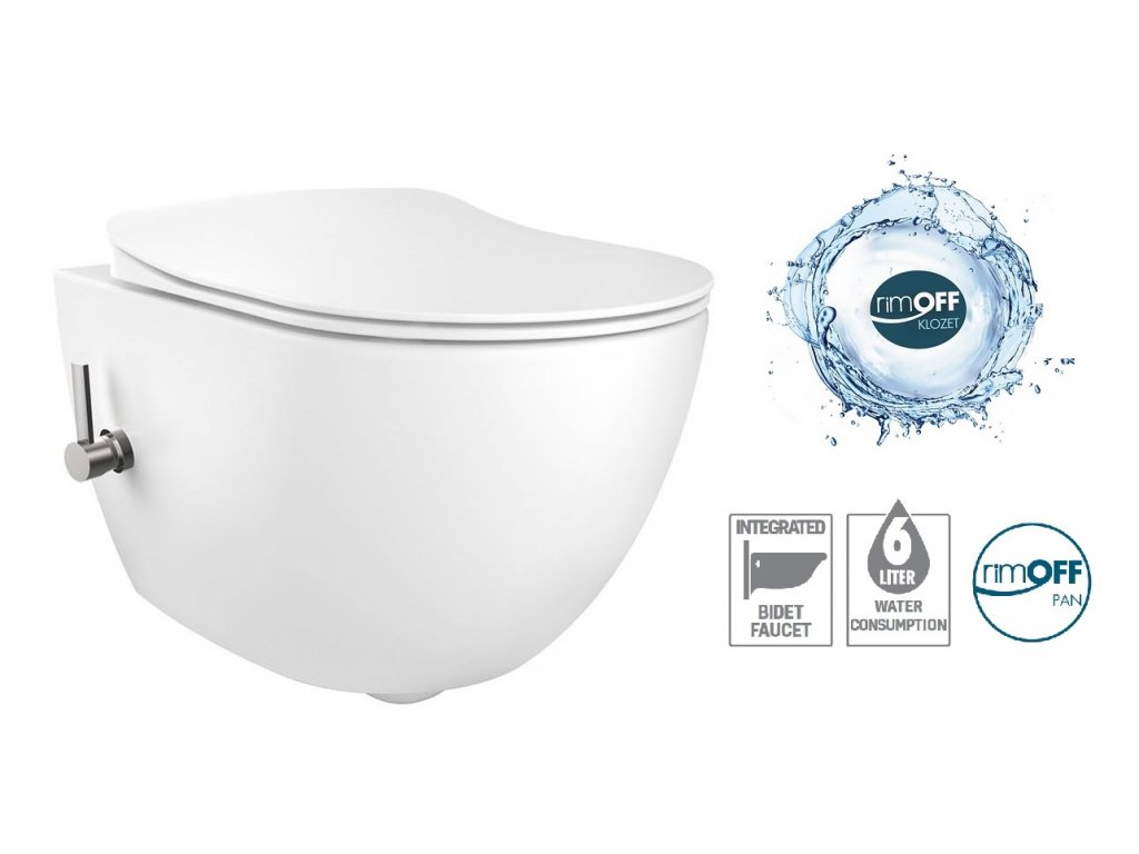 Závěsná wc mísa Free se a zabudovanou bidetovou tryskou a bez splachovacího okruhuNOVINKA – Závěsný WC+bidet 2v1 FE322–34CB00E-0001 RIMFREE bez splachovacího okruhu uvnitř mísy a se ZABUDOVANOU PÁKOVOU BATERIÍ na ovládání přívodu vody do trysky.