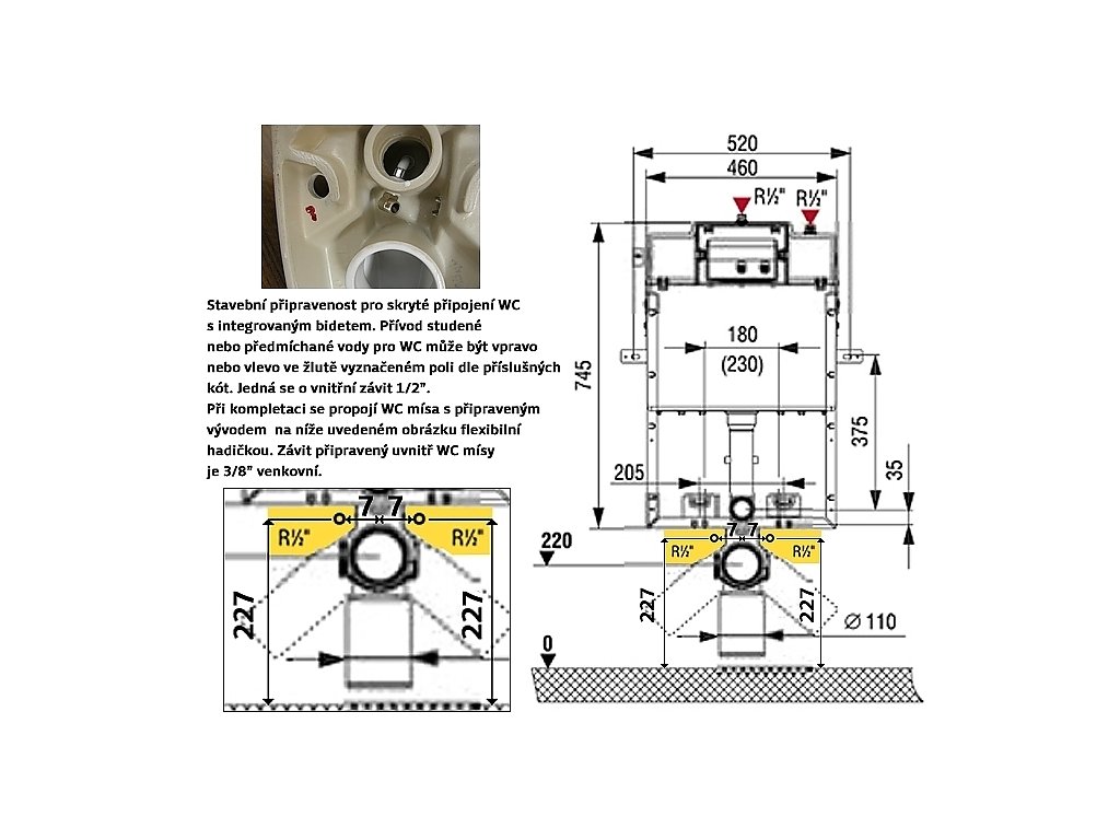 SPLACHOVÁNÍ: Závěsné WC+bidet jsou kompatibilní se splachovacími moduly Geberit, Creavit a ostatními běžné prodávanými na českém trhu. Rozteč nosných šroubů je 18 cm a to i v případě, že na technickém listě je 23 cm – tento rozměr je možný pouze na objednávku.