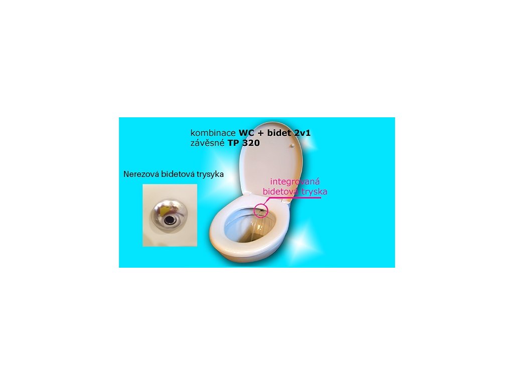 Závěsná wc mísa Standard se zabudovanou nerezovou bidetovou tryskouKombinace klozetu a bidetu. Úsporné řešení intimní hygieny pro muže, ženy i děti. Závěsná wc mísa s integrovanou nerezovou bidetovou tryskou TP320. Jedná se o standardní závěsné wc s nerezovou bidetovou tryskou na které lze napojit studenou nebo teplou – předmíchanou vodu. Nerezová tryska je propojena do zadní dutiny závěsné mísy.
