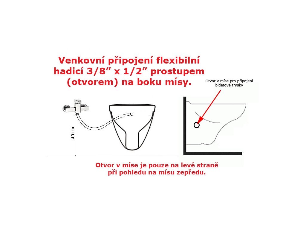 Popis připojeníMísa s nerezovou bidetovou tryskou se dá jednoduše napojit na studenou vodu flexihadičkou a rohovým ventilem (kombinovaným ventilem). Pokud chcete vodu teplou a venkovní připojení otvorem na boku mísy, tak použijete nástěnou pákovou nebo termostatickou baterii. Pokud chcete tzv. skryté připojení, tak použijete podomítkový ventil, podomítkovou pákovou baterii, nebo podomítkovou termostatickou baterii. Připojovací rozměr závitu ve vnitřní dutině mísy – vnější závit 3/8"