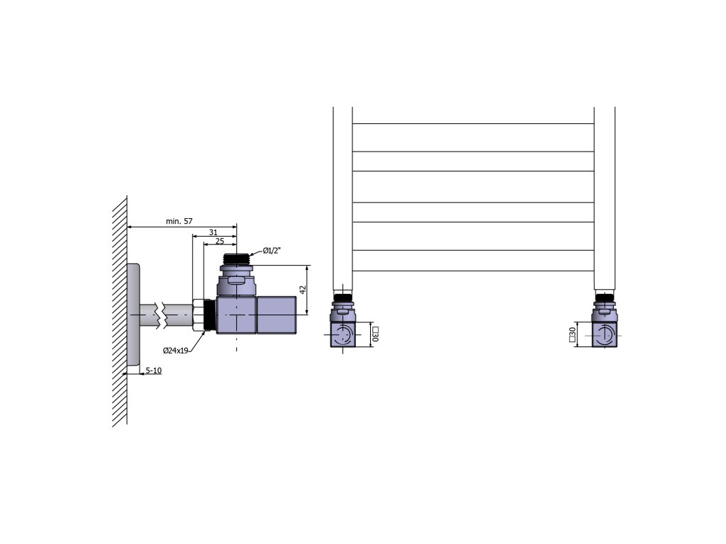 Designová sada ručních ventilů bez termostatické hlavice pro připojení hranatých designových radiátorů s vnitřním závitem G1/2" Ventily jsou osazeny těsnícími O-kroužky pro spolehlivou a rychlou montáž. Sada není vhodná pro kombinaci s elektrickým topným tělesem.