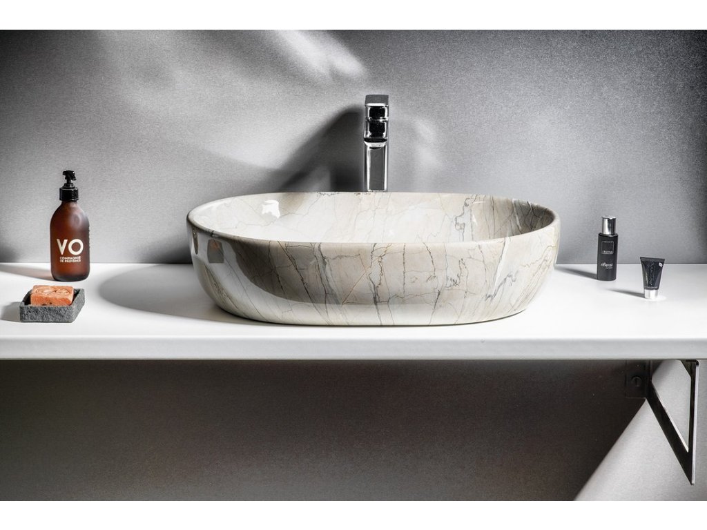 Série keramických umyvadel DALMA zaujme kamenným efektem. Umyvadla jsou glazovaná s vypálenými obtisky v designu kamene, čímž je zaručena stálost a trvanlivost dekoru. Vybírat můžete nejen ze tří dekorů v odstínech mramoru, ale i z pěti tvarů. Umyvadla jsou určena k postavení na desku, ke všem lze dokoupit uzavíratelnou výpust v barvě umyvadla.