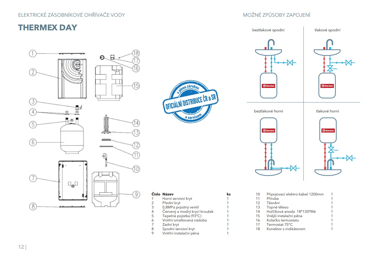 Zásobníky vody Thermex Day jaou určené pro tlakový nebo beztlakový provoz. Beztlakový provoz je podmíněn použitím s beztlakovou třícestnou baterií.