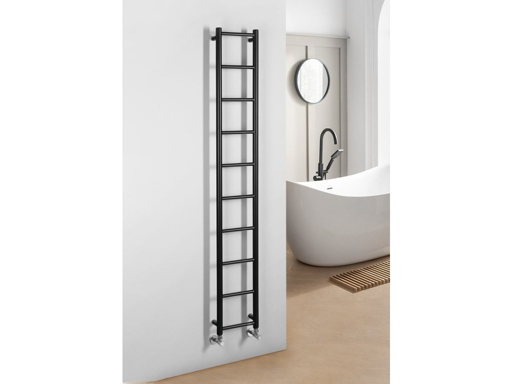 Elegantní koupelnový radiátor ze správně kombinovaných průměrů vodorovných a svislých trubek. Krása v jednoduchosti skloubená s atraktivním barevným provedením.