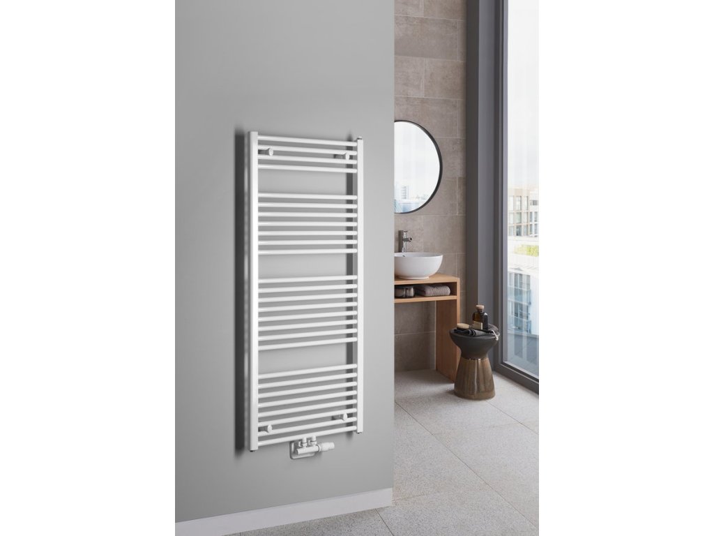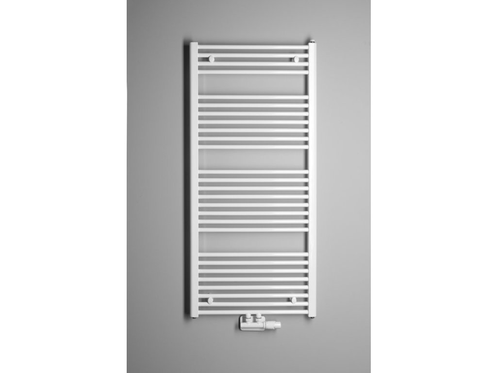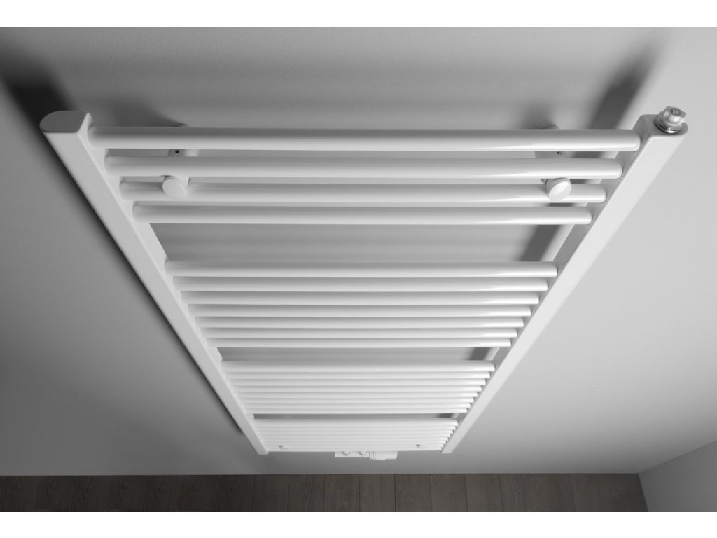Tradičně tvarované otopné těleso z ocelových trubek v bílém provedení s rovnými vodorovnými profily, středové připojení s roztečí 50 mm.