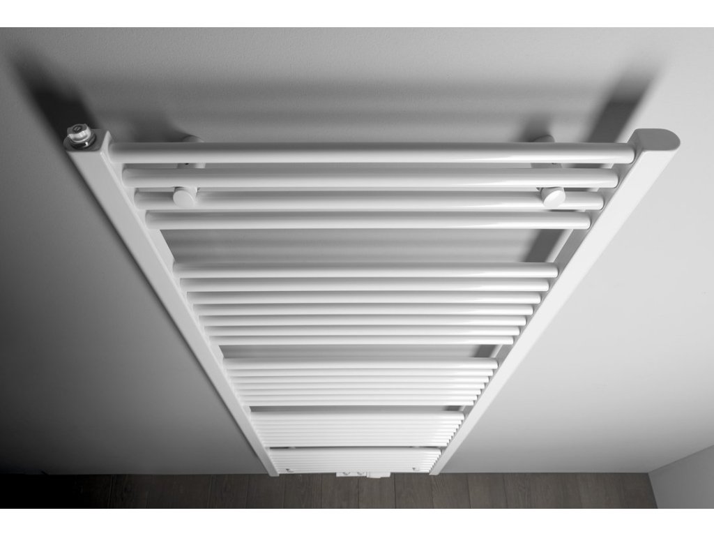 Tradičně tvarované otopné těleso z ocelových trubek v bílém provedení s rovnými vodorovnými profily, středové připojení s roztečí 50 mm.