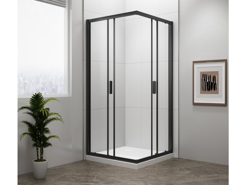 - Čtvercové zástěny s dvoudílnými posuvnými dveřmi, rohový vstup