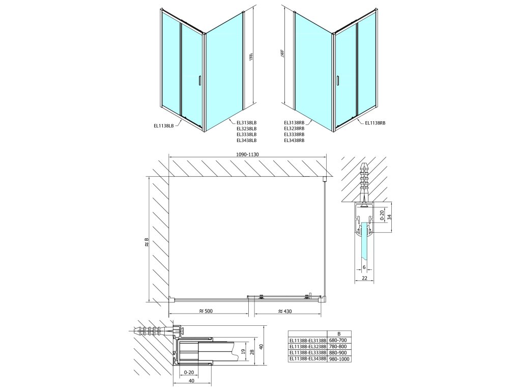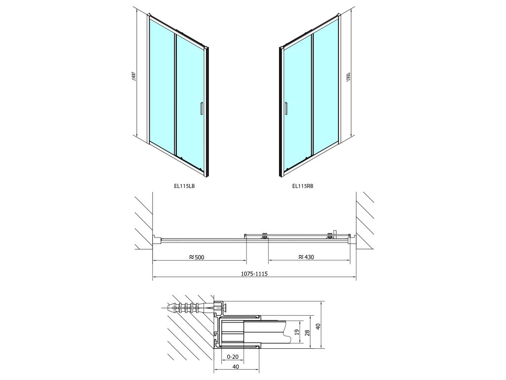 - Instalační rozměr dveří do niky lze díky rozšiřovacímu profilu EL825 zvětšit o 25 mm na každou stranu, celkem o 50 mm