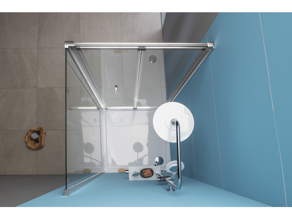 - Čtvercové zástěny s dvoudílnými posuvnými dveřmi, rohový vstup