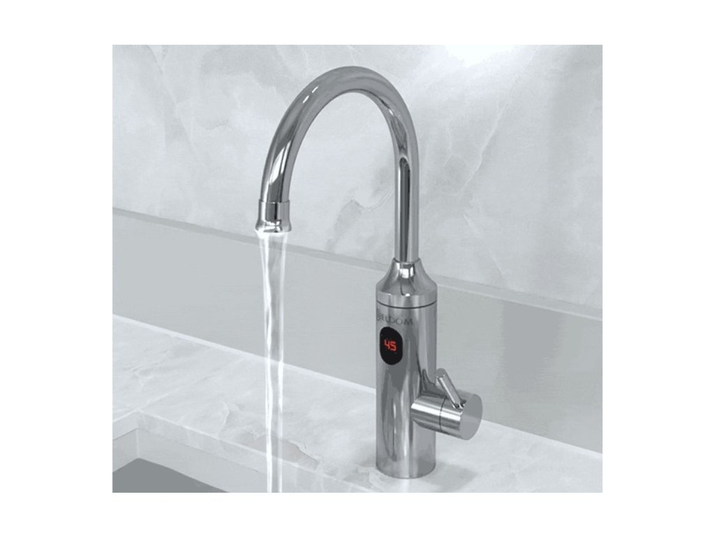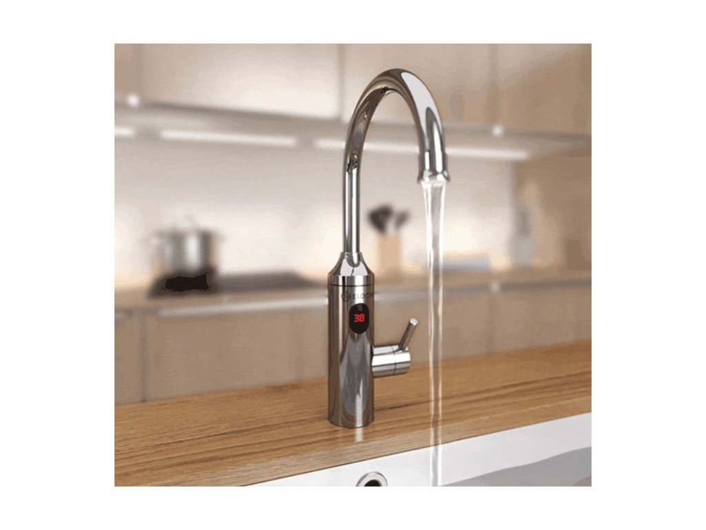 Vodovodní baterie s elektrickým ohřevem 3,3 kW, nerezové kovové ramínko otočné o 360°.