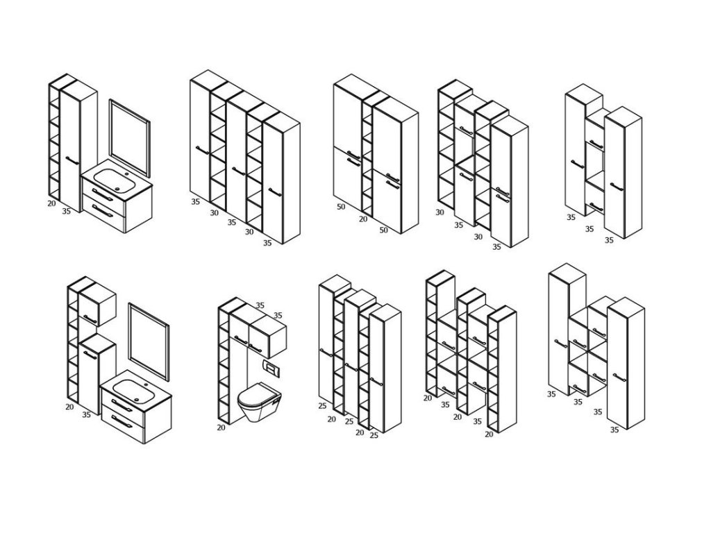 Skříňky nabízíme v barevném provedení a dekorech lamina se strukturou dle vzorníku. K některým skříňkám lze dokoupit samostatnou vnitřní zásuvku, případně vyjímatelný a pratelný látkový prádelní koš na suchý zip. Skříňky lze instalovat jak s levým, tak s pravým otvíráním dvířek – pouhým otočením dvířek o 180° získáme potřebnou variantu.