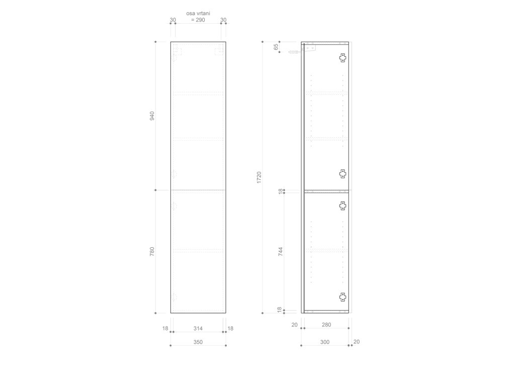 Charakteristickým rysem série doplňkových skříněk ESPACE je variabilita díky široké nabídce rozměrů jak dvířkových, tak otevřených skříněk. Série ESPACE byla navržena pro kombinaci s většinou umyvadlových skříněk z naší nabídky, avšak skříňky naleznou využití i v jiných prostorách než je koupelna (obývací pokoj, předsíň apod.).