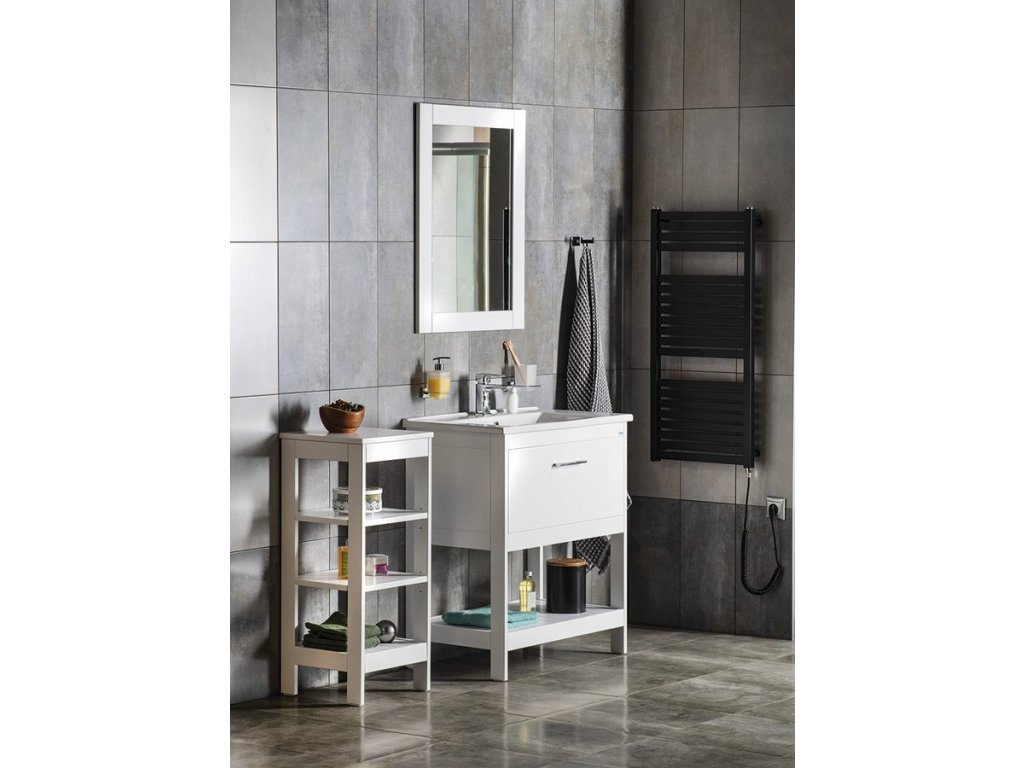 Umyvadlové skříňky doplňují koupelnové regály ve třech velikostech. Vysoký a nízký se čtvercovou základnou a nízký s obdélníkovou základnou. Regály lze postavit nejen v koupelně, ale i v jiných místnostech.