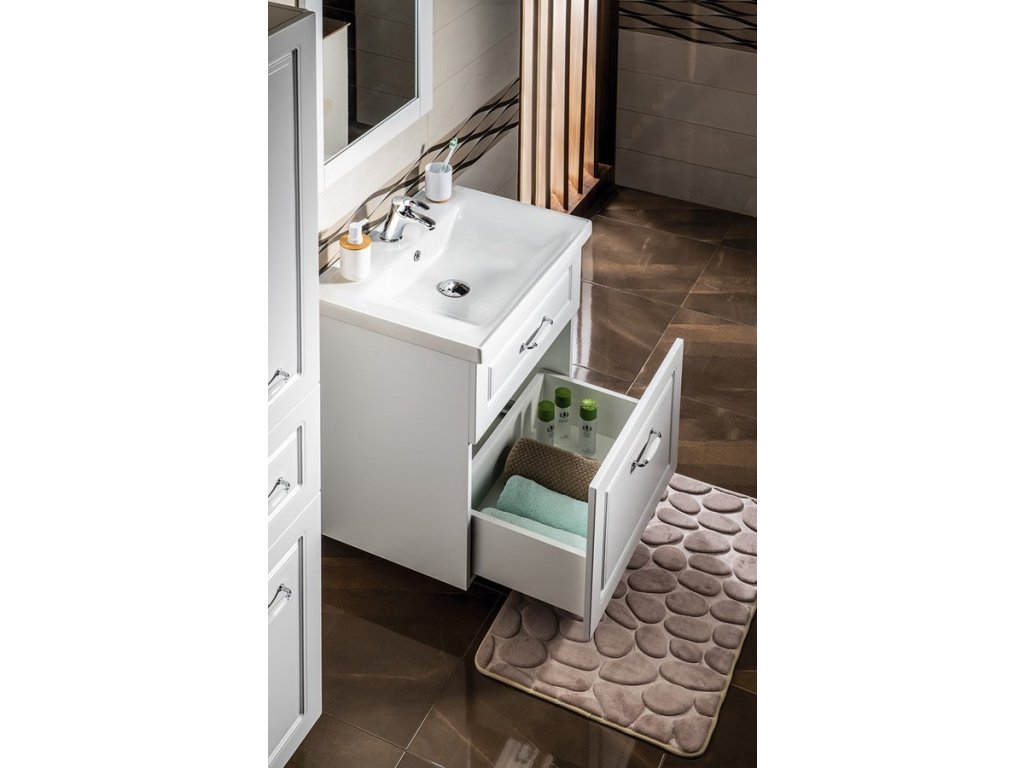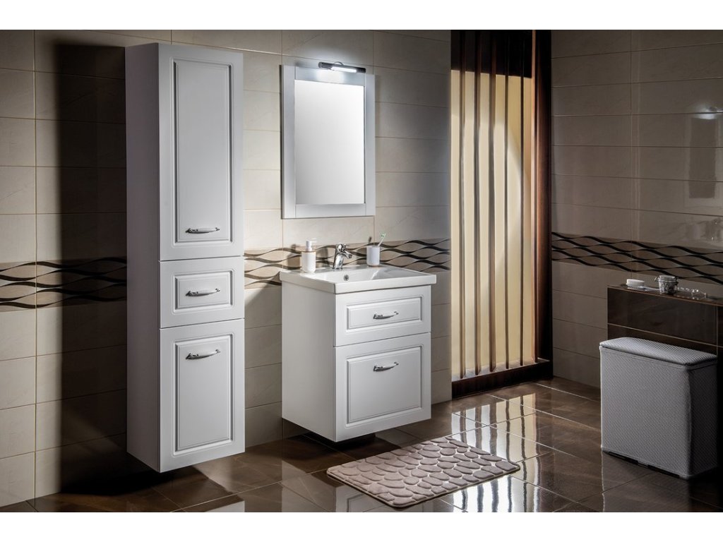 FAVOLO je klasická série koupelnového nábytku s decentně frézovaným dekorem na čelech zásuvek a dvířkách v bílém matném provedení. Umyvadlové skříňky lze kombinovat se zrcadly a doplňkovými skříňkami ve stejném stylu a odstínu. Elegantní umyvadla podtrhují vzhled celé série, která se hodí nejen na chalupu či do činžovního domu ze začátku 20. století.