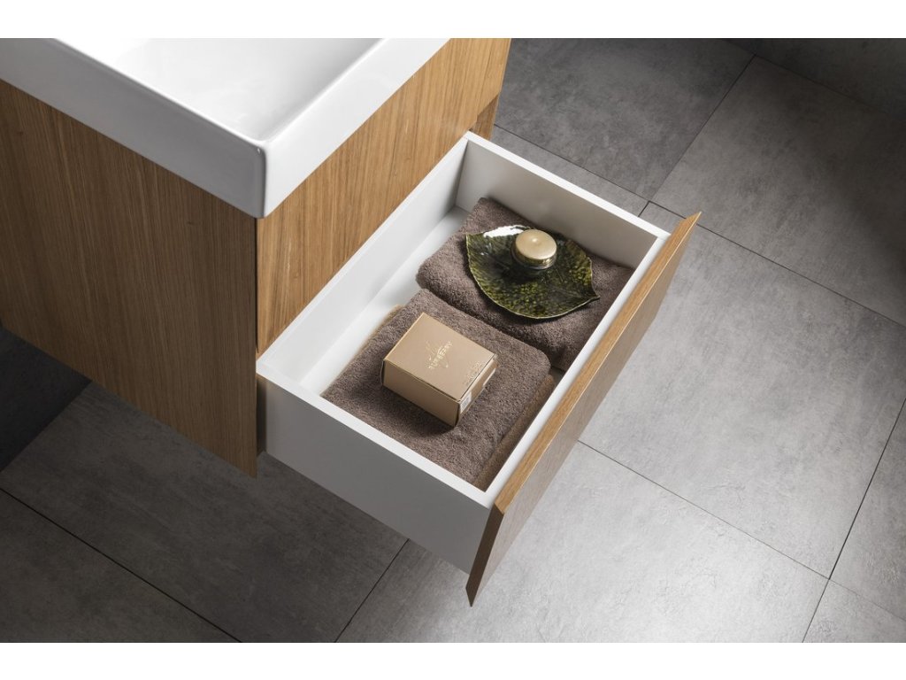 Dokonale decentní série koupelnového nábytku FILENA nabízí skříňky z dubové dýhy v přírodním provedení dekoru dřeva ošetřeném transparentním lakem, v bílém matném lakování a v černě matném lakovaném drážkovaném designu. Ostré zkosené hrany pod úhlem 45° čel zásuvek a dvířek vytváří tenkou linii, která je pro sérii charakteristická. Čistý design není rušen úchytkou, pohodlné otevírání umožňuje zkosená hrana a otvor mezi zásuvkami.