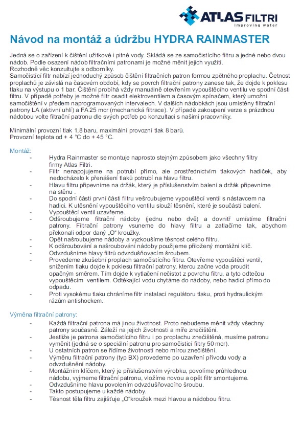 Domovní filtr Atlas Hydra Rainmaster Duo se dvěma nádobami s mechanickým čištěním a aktivním uhlímDvoustupňový domovní filtrAtlas Hydra Rainmaster Duo s aktivním uhlím