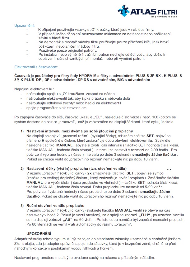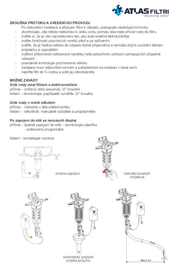 Jedná se o zařízení k čištění užitkové i pitné vody. Skládá se ze samočistícího filtru a jedné nebo dvou nádob. Podle osazení nádob filtračními patronami je možné měnit jejich využití. Rozhodně věc konzultujte s odborníky. Samočistící filtr nabízí jednoduchý způsob čištění filtračních patron formou zpětného proplachu. Četnost proplachů je závislá na časovém období, kdy se povrch filtrační patrony zanese tak, že dojde k poklesu tlaku na výstupu o 1 bar. Čištění probíhá vždy manuálně otevřením vypouštěcího ventilu ve spodní části filtru. V případě potřeby je možné filtr osadit elektroventilem a časovým spínačem, který umožní samočištění v předem naprogramovaných intervalech. V dalších nádobkách jsou umístěny filtrační patrony LA (aktivní uhlí) a FA 25 mcr (mechanická filtrace). V případě zakoupení verze s prázdnou nádobou volte filtrační patronu dle svých potřeb po konzultaci s našimi pracovníky. Minimální provozní tlak 1,8 baru, maximá
