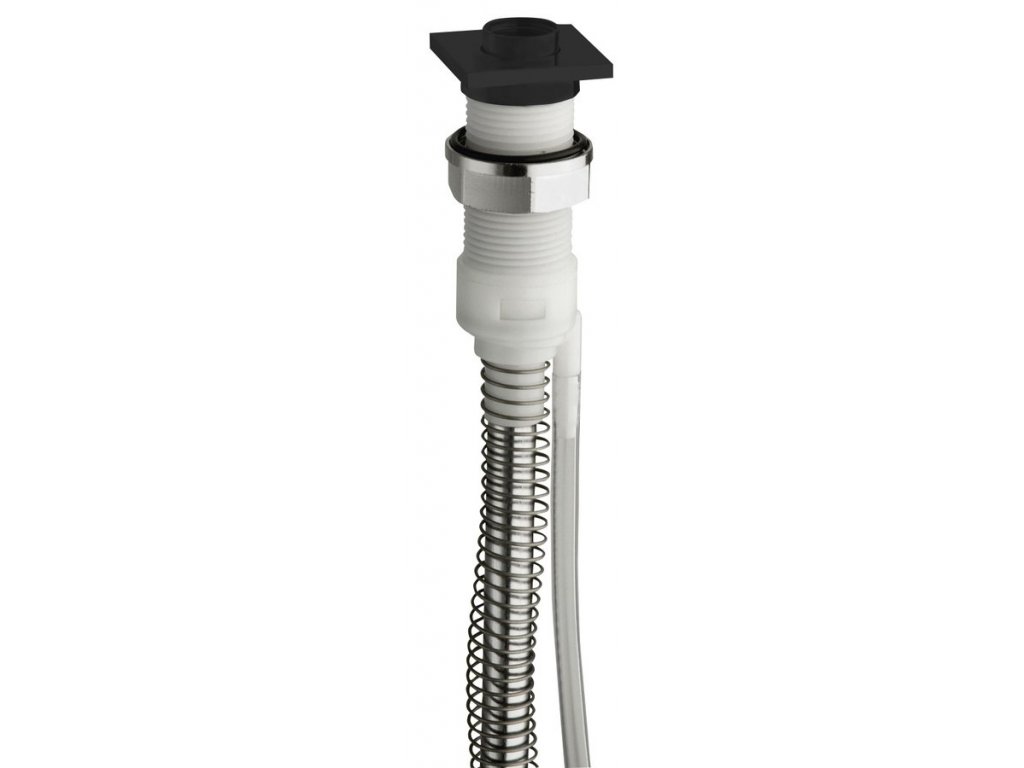 Systém výsuvu hadice pro montáž na hranu vany. Ruční sprcha se vratnou pružinou navrací zpět a zároveň je hadice osušena. Systém navíc pomocí drenáže zamezuje zatékání vody pod vanu.
