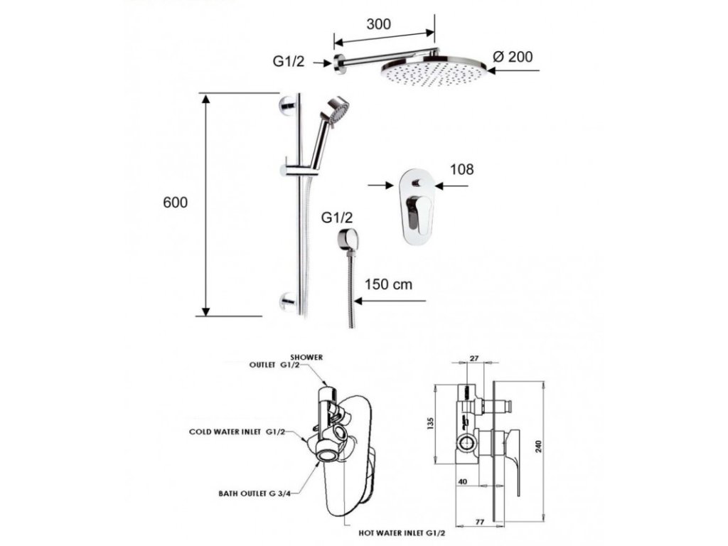 - Příslušenství: hlavová sprcha, držák sprchy, sprchová tyč, ruční sprcha, vývod ze stěny s hadicí pro ruční sprchu