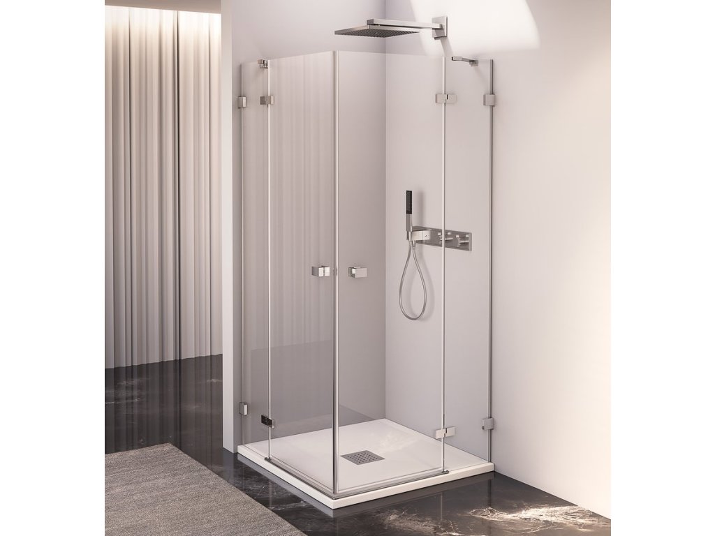 Bezprofilové pantové zástěny FORTIS EDGE v moderním hranatém designu. Minimalistické pochromované panty v nekompromisním hranatém designu, zevnitř zapuštěné pro snadné čištění a se zvedací funkcí pro pohodlné otevírání. Bezpečnostní čiré sklo v tloušťce 8 mm je ošetřené povrchovou úpravou ANTIDROP pro snadné čištění. Výška 2000 mm. Hranaté pochromované madlo ve stejném minimalistickém designu jako panty.