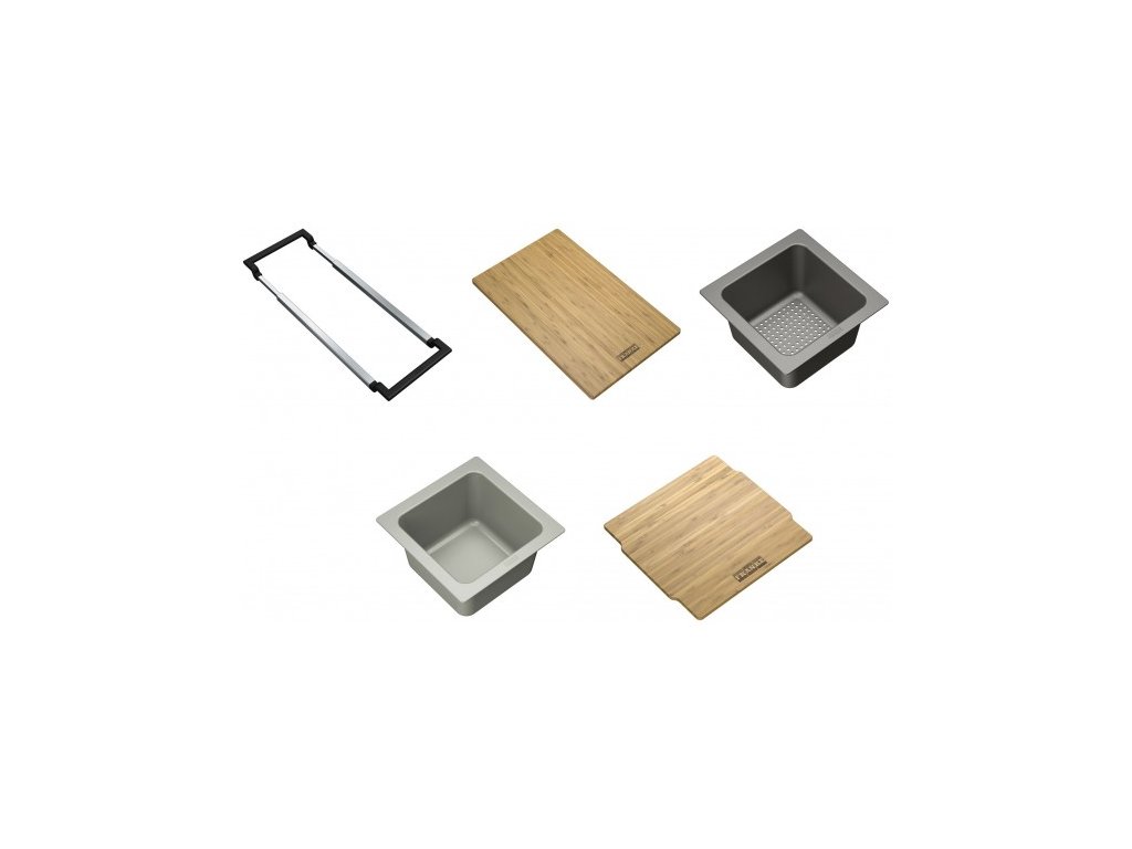 Flexibilní systém doplňků vhodný pro všechny dřezy s rozměrem vany do 540 mm. Díky teleskopickému držáku můžete set umístit na délku i na šířku vany dřezu. Obsahuje teleskopický držák, bambusovou přípravnou desku, malou odkapávací misku, malou misku a bambusové víko na malou misku. Všechny komponenty jdou dokoupit samostatně.