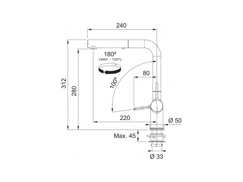 Stojánková dřezová baterie, provedení Matná černá (nástřik), výška 312 mm, vytahovací koncovka s přepínačem na sprchu, pro otvor 35 mm, otočná o 180°.
