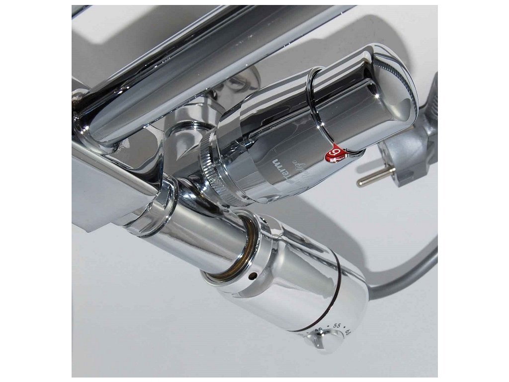 Designový termostatický ventil osazený termostatickou hlavicí spolu s regulačním šroubením INTEGRA slouží pro připojení otopného tělesa se spodním krajním připojením k rozvodu a současně přímé instalaci elektrická topné tyče to tělesa.