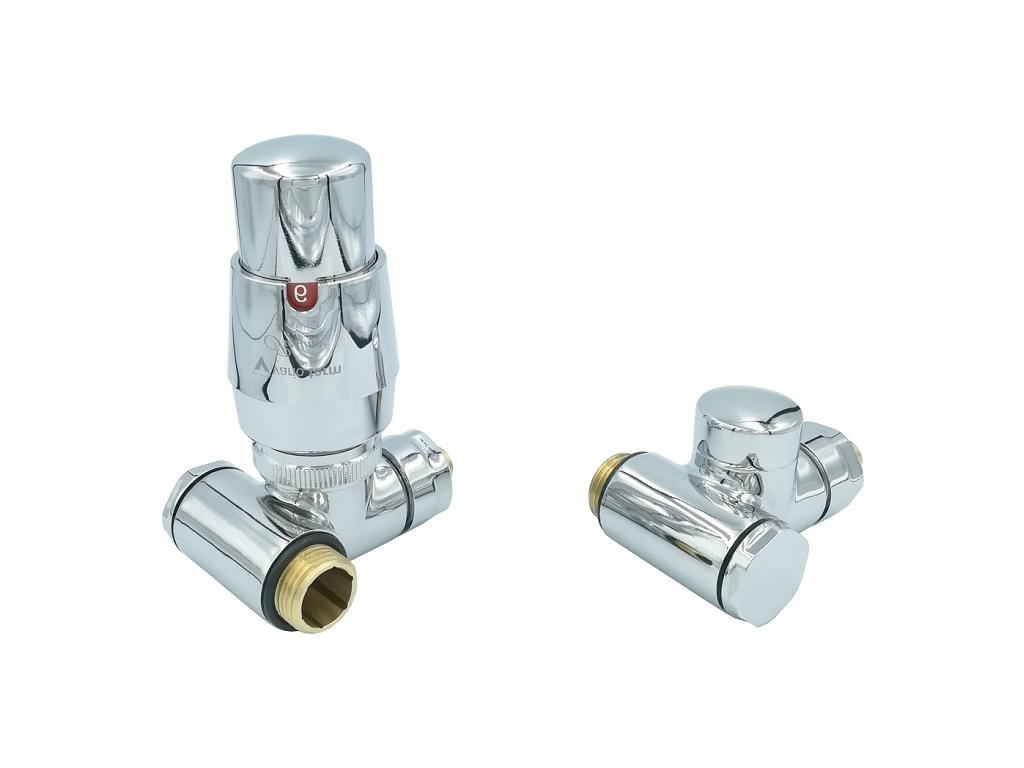 Designový termostatický ventil osazený termostatickou hlavicí spolu s regulačním šroubením INTEGRA slouží pro připojení otopného tělesa se spodním krajním připojením k rozvodu a současně přímé instalaci elektrická topné tyče to tělesa.
