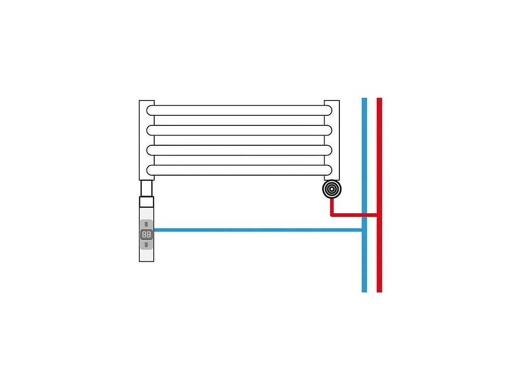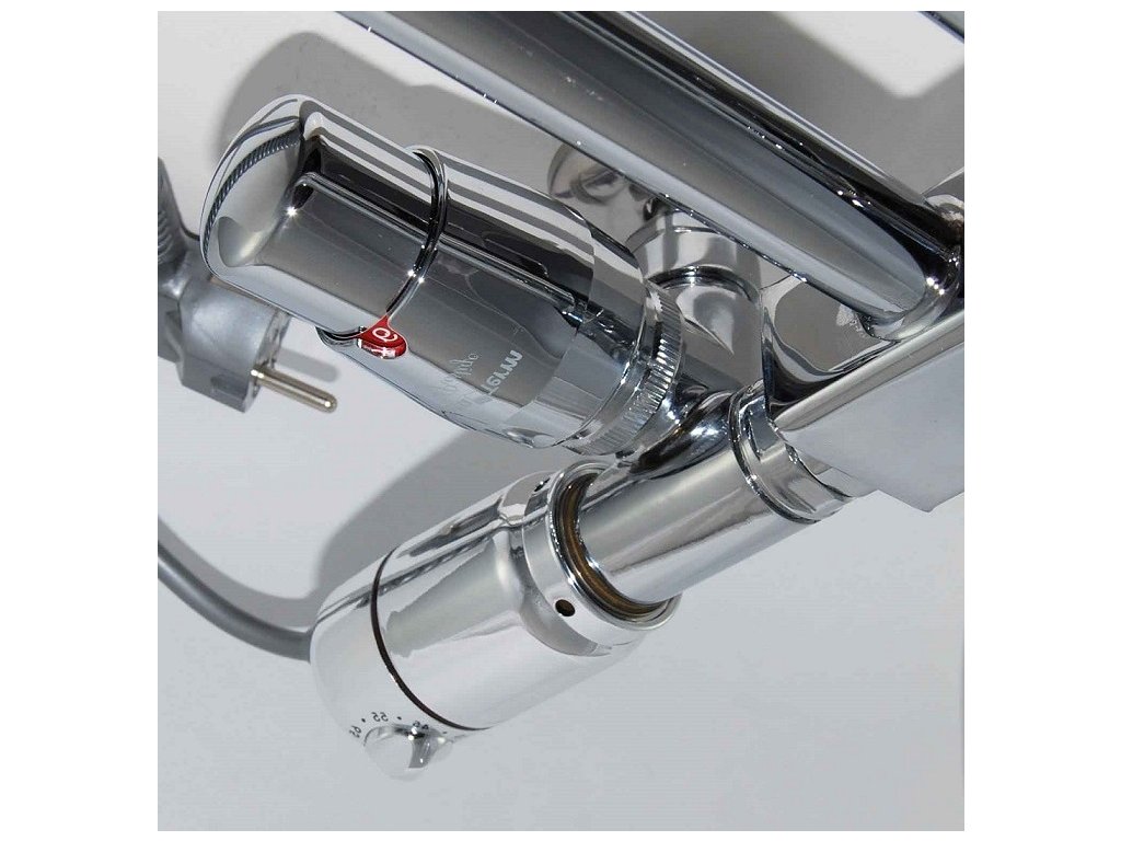 Designový termostatický ventil osazený termostatickou hlavicí spolu s regulačním šroubením INTEGRA slouží pro připojení otopného tělesa se spodním krajním připojením k rozvodu a současně přímé instalaci elektrická topné tyče to tělesa.