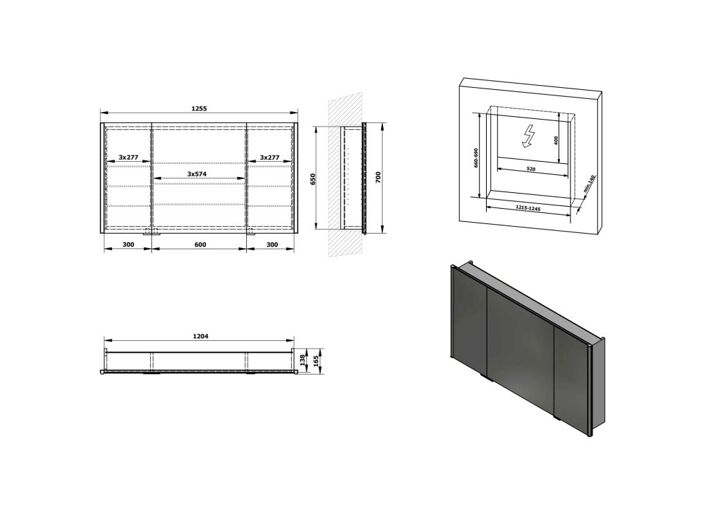 | Výbava | Osvětlení, Oboustranná zrcadlová dvířka, Zpomalovací panty, Zápustné do zdi |