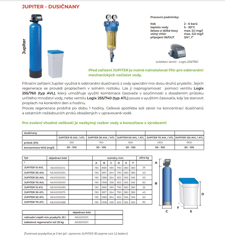 Filtrační zařízení Jupiter využívá k odstranění dusičnanů z vody speciální mix dvou druhů pryskiřic. Jejich regenerace se provádí proplachem v solném roztoku. Lze ji naprogramovat pomocí ventilu Logix 255/760 (typ AVL), který umožňuje využití kombinace časovače v součinnosti s dosažením průtoku určitého množství vody, nebo ventilu Logix 255/740 (typ ATL) pouze s využitím časovače, kdy lze stanovit proplach na konkrétní den a hodinu. Proces regenerace probíhá po dobu 1 hodiny. Celková spotřeba soli závisí na koncentraci dusičnanů a ostatních nežádoucích prvků obsažených v upravované vodě.
