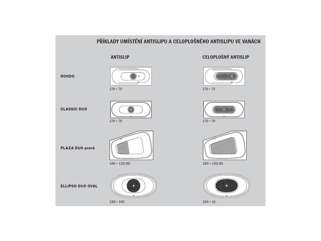AntislipKaldewei Antislip umožňuje bezpečný vstup do koupelové nebo sprchové vany. Protiskluzový smaltovaný povrch Antislip je pevně spojen se smaltovanou ocelí Kaldewei 3,5 mm: je to strukturovaný povrch z natrvalo vpálené křemenopísčité směsi pro větší bezpečnost v koupelně. A není jen absolutně hygienický, ale vydrží i po celou dobu životnosti vany.