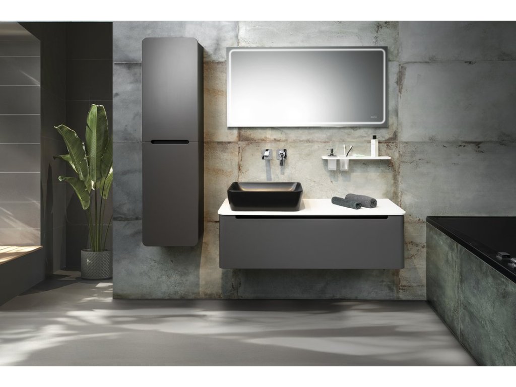 Lakovaná série nábytku KERALA pro umyvadla na postavení v moderních matných barvách se vyznačuje výrazným designovým prvkem - zaoblenými boky a čelem zásuvky. Skříňky jsou jednozásuvkové, bezúchytkové a s plynulým dovíráním. V nabídce jsou 2 typy desek o tl.12 mm: bílá matná Rockstone a černá matná kompaktní deska PREMIO z vysokotlakého laminátu. Umyvadlo na desku lze libovolně umístit po celé šířce skříňky. Umyvadlové skříňky nabízíme v šířkách 80, 100, 120 a 140 cm a lze je doplnit o vysokou dvířkovou skříňku ve stejném oblém designu.
