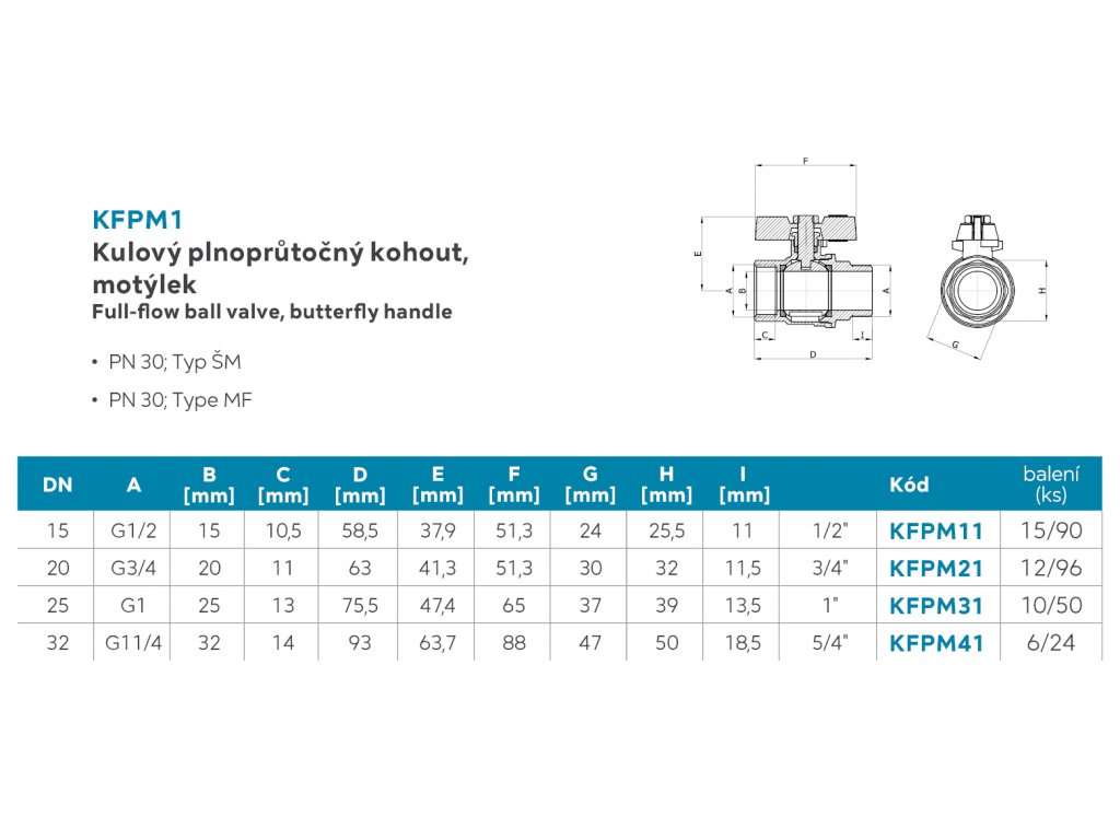 Kulový plnoprůtočný kohout 1/2", motýlek ŠM - jeden vnější závit