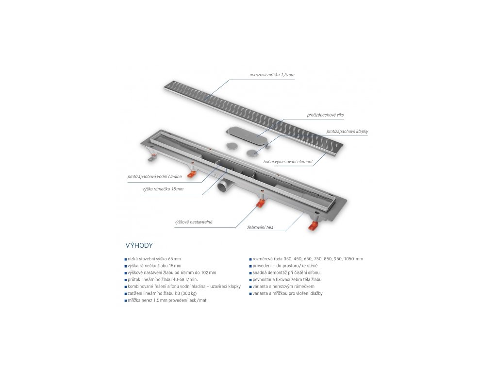 V každé moderní koupelně by neměl chybět sprchový odtokový žlab, který splňuje normu EN 1253 a díky unikátnímu protizápachovému systému, nízké stavební výšce, vysokému průtoku, široké škále nadčasových nerezových mřížek, splňuje požadavky náročného zákazníka a je tak ideálním řešením pro vaši koupelnu. Spodní část je vyrobena z PP a PS, rámeček žlabu a krycí mřížka jsou vyrobeny z nerez oceli dle DIN 1.4301 s možností zátěže K3 do 300 kg. Minimální stavební výška je 80 mm a žlab je výškově nastavitelný. Připojení na kanalizační potrubí 50 mm. Součástí balení je samolepící hydroizolační fólie, stavitelné podpěry, hmoždinky s vrutem, plastový klíč pro vyjmutí nerezové mřížky a montážní návod.