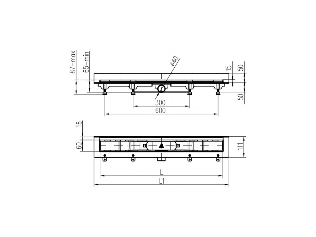 Spodní část je vyrobena z polypropylénu, krycí mřížka je z 1,5 mm nerez oceli DIN 1.4301 s možností zátěže K3 do 300 kg. Minimální stavební výška je 65 mm a žlab je výškově nastavitelný. Připojení na kanalizační potrubí Ø 40 mm. Součástí balení je montážní návod, samolepící hydroizolační fólie, stavitelné šrouby a natloukací hmoždinky s vrutem.