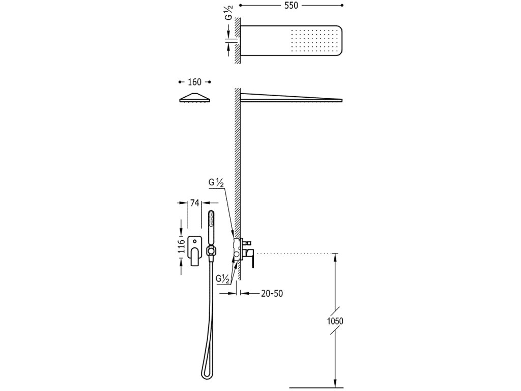 - Nástěnné sprchové kropítko z nerez. oceli 160×550 mm